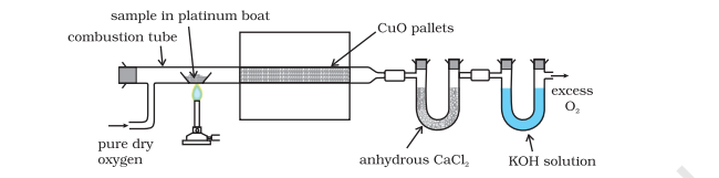 Both carbon and hydrogen are estimated in one experiment. A known mass of an organic compound is burnt in the presence of excess of oxygen and copper(II) oxide. Carbon and hydrogen in the compound are oxidised to carbon dioxide and water respectively.