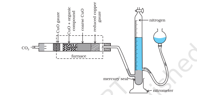 Traces of nitrogen oxides formed, if any, are reduced to nitrogen by passing the gaseous mixture over a heated copper gauze. The mixture of gases so produced is collected over an aqueous solution of potassium hydroxide which absorbs carbon dioxide. Nitrogen is collected in the upper part of the graduated tube (Fig.8.15).