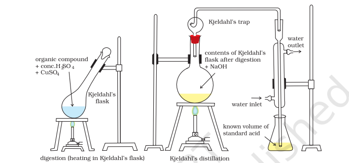 (ii) Kjeldahl’s method: The compound containing nitrogen is heated with concentrated sulphuric acid. Nitrogen in the compound gets converted to ammonium sulphate (Fig. 12.16). The resulting acid mixture is then heated with excess of sodium hydroxide. The liberated ammonia gas is absorbed in an excess of standard solution of sulphuric acid. The amount of ammonia produced is determined by estimating the amount of sulphuric acid consumed in the reaction. It is done by estimating unreacted sulphuric acid left after the absorption of ammonia by titrating it with standard alkali solution. The difference between the initial amount of acid taken and that left after the reaction gives the amount of acid reacted with ammonia.
