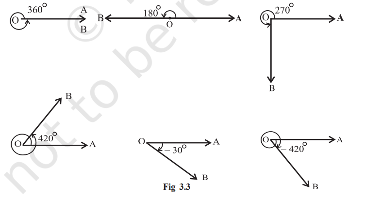 Some of the angles whose measures are $360^{\circ}, 180^{\circ}, 270^{\circ}, 420^{\circ},-30^{\circ},-420^{\circ}$ are shown in Fig 3.3.