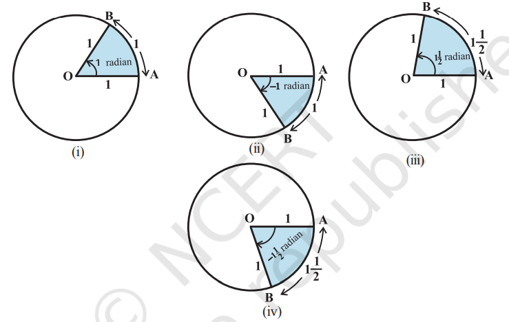 There is another unit for measurement of an angle, called the radian measure. Angle subtended at the centre by an arc of length 1 unit in a unit circle (circle of radius 1 unit) is said to have a measure of 1 radian. In the Fig 3.4(i) to (iv), $OA$ is the initial side and $OB$ is the terminal side. The figures show the angles whose measures are 1 radian, -1 radian, $1 \dfrac{1}{2}$ radian and $-1 \dfrac{1}{2}$ radian.