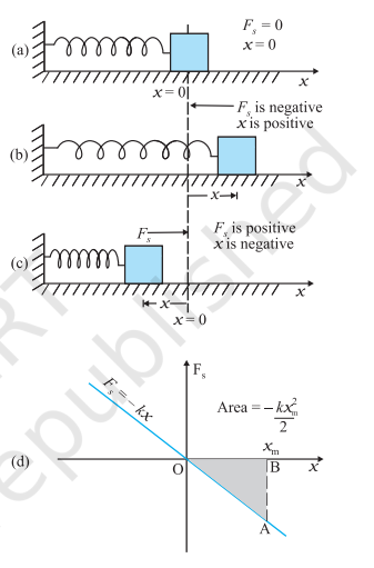 The spring force is an example of a variable force which is conservative. Fig. 5.7 shows a block attached to a spring and resting on a smooth horizontal surface. The other end of the spring is attached to a rigid wall. The spring is light and may be treated as massless. In an ideal spring, the spring force $F_s$ is proportional to $x$ where $x$ is the displacement of the block from the equilibrium position. The displacement could be either positive [Fig. 5.7 (b)] or negative [Fig. 5.7(c)]. This force law for the spring is called Hooke’s law and is mathematically stated as